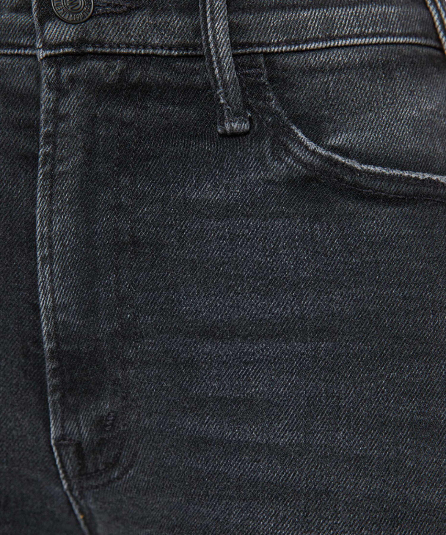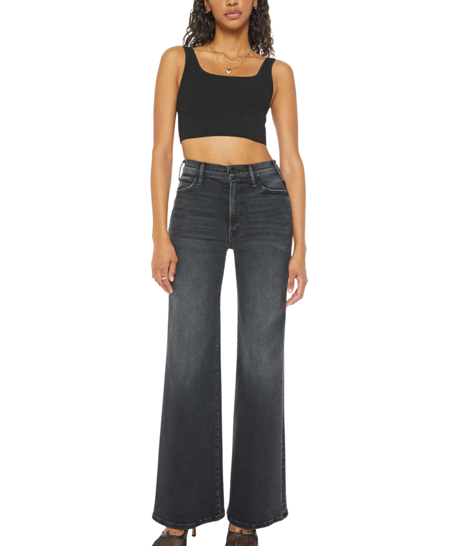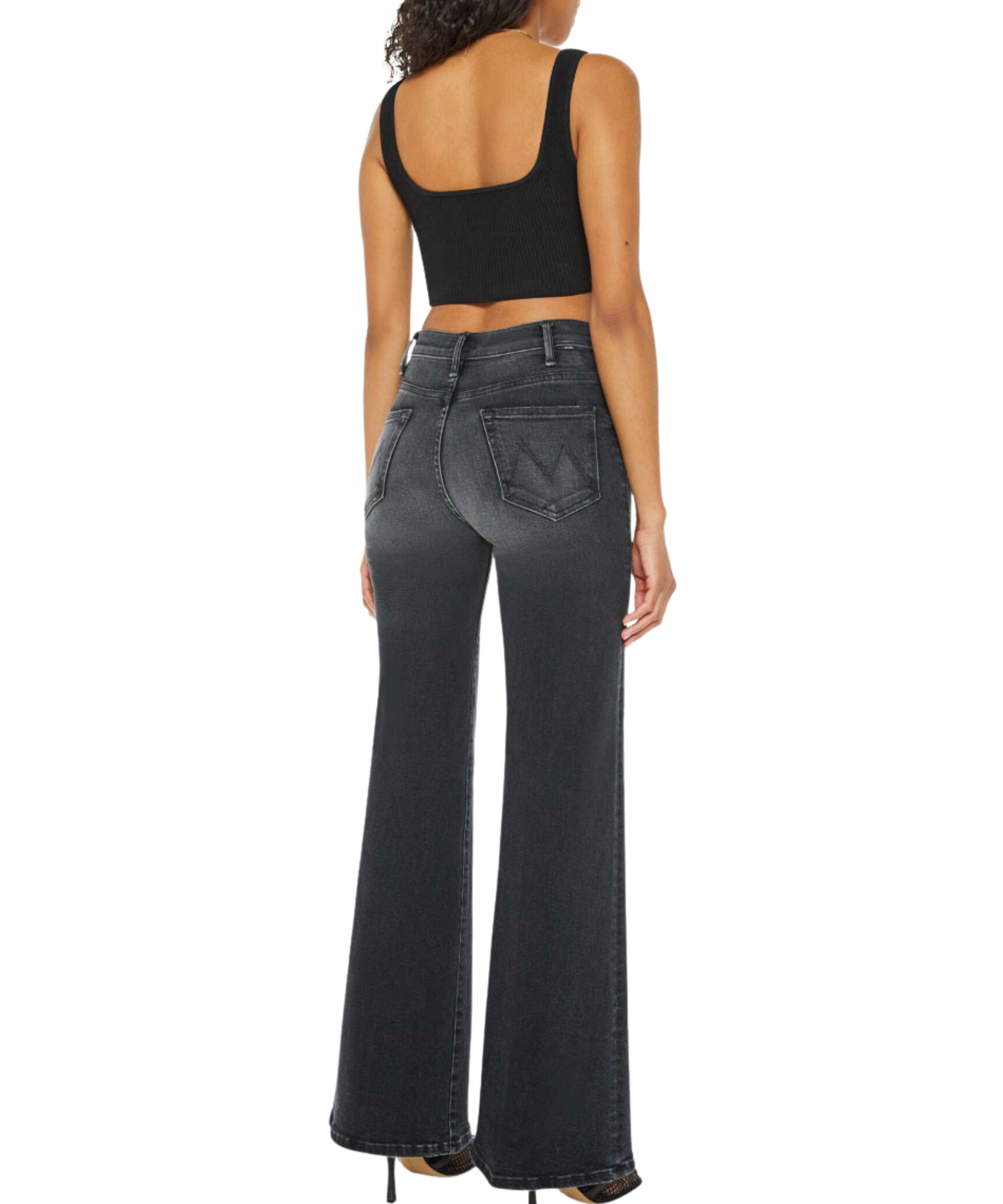 Hell no. 70s-inspired wide leg jeans with a high rise, 32-inch inseam and a clean hem. Designed in a stretch cotton blend, Not Today Satan is a black wash with whiskering, fading and tonal hardware.